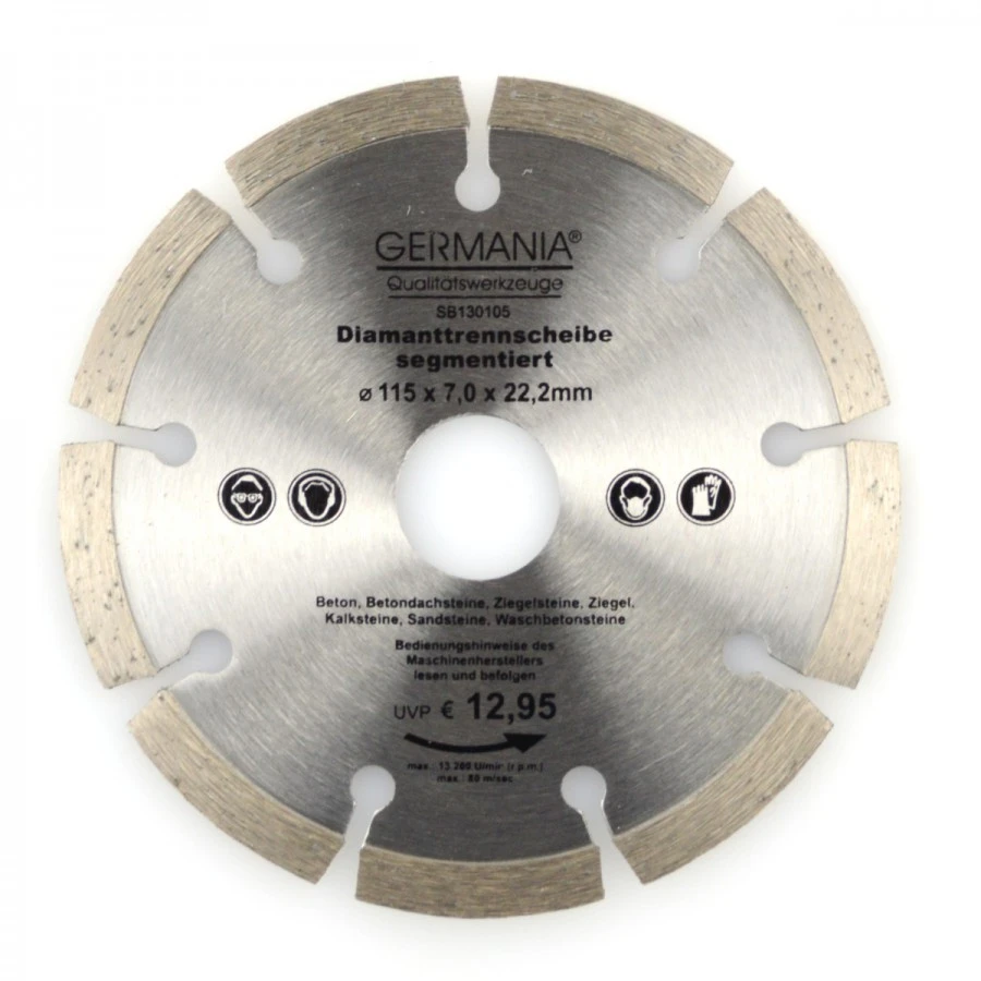 Dieses besondere Segment ist mit Industriediamanten versetzt, welche der Trennscheibe zu ihrer Härte und Schnittfestigkeit verhelfen. Die eingesetzten Diamanten werden industriell hergestellt da Naturdiamanten zu brüchig und spröde sind. Mit dieser segementierten Trennscheibe können Sie an Beton (alt, armiert), Betondachstein, Ziegelstein, Ziegel, Kalkstein, Sandstein und Waschbetonstein arbeiten. Die Diamanttrennscheibe eignet sich für mittelharte Werkstoffe.
