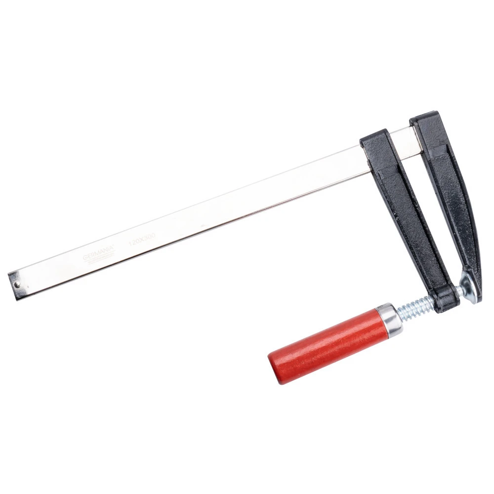 GERMANIA Bastel-Schraubzwinge mit einem Spannbereich von 300 x 120 mm. Die Schraubzwinge hat eine verzinkte Profilschiene, Kunststoff-Schutzbacken und hölzernem Griff, rot lackiert.