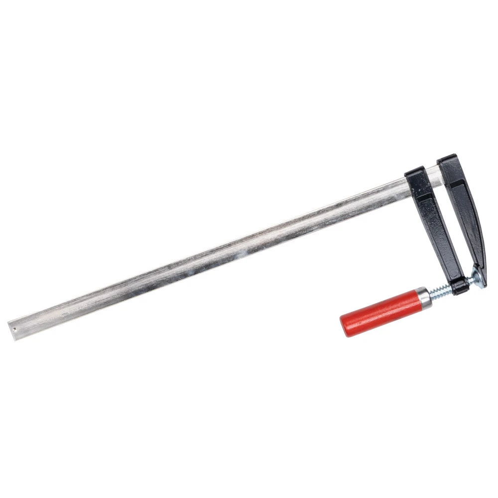 GERMANIA Bastel-Schraubzwinge mit einem Spannbereich von 500 x 120 mm. Die Schraubzwinge hat eine verzinkte Profilschiene, Kunststoff-Schutzbacken und hölzernem Griff, rot lackiert.